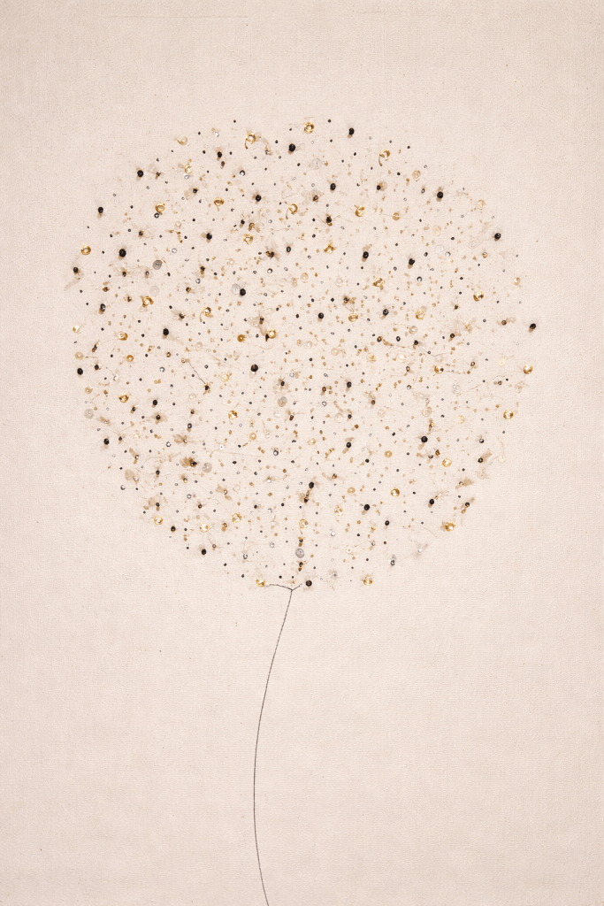 Los puntos nacen de lentejuelas de un jersey y pequeñas piedras de una pulsera. Objetos sencillos, de la vida cotidiana, que recuerdan algo simple: la mayoría de las cosas son buenas.