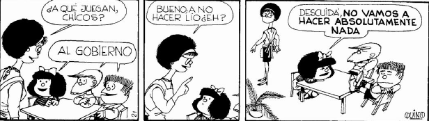 gobierno Publicado 10 mayo, 2010 en 616 × 174 en Mafalda dixit. ← Anterior Siguiente → Compartir, imprimir y bla, bla, bla... Enviar un enlace a un amigo por correo electrónico (Se abre en una ventana nueva) Correo electrónico Imprimir (Se abre en una ventana nueva) Imprimir Compartir en Reddit (Se abre en una ventana nueva) Reddit TweetCompartir en TumblrMe gusta Cargando...
