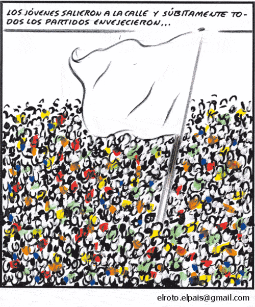 Ya he dicho lo que pienso la última vez en el blog de Arístides. Creo que todo se fraguó en un despacho y después la bola se ha hecho mas grande y ahora ya están convencidos de que son libres y nadie les manipula, pero estan siendo manipulados y no se han enterado. (Es lo que pienso) No quiero ofender a nadie. Ya sé que lo correcto es decir que se les apoya y que se está con ellos, pero a mí me parece todo demasiado «espontáneo». Y a una semana de votar, no sé me suena muy raro. Si quieren cambiar las cosas que voten a partidos pequeños y así cambiarán el bipartidismo. Chao