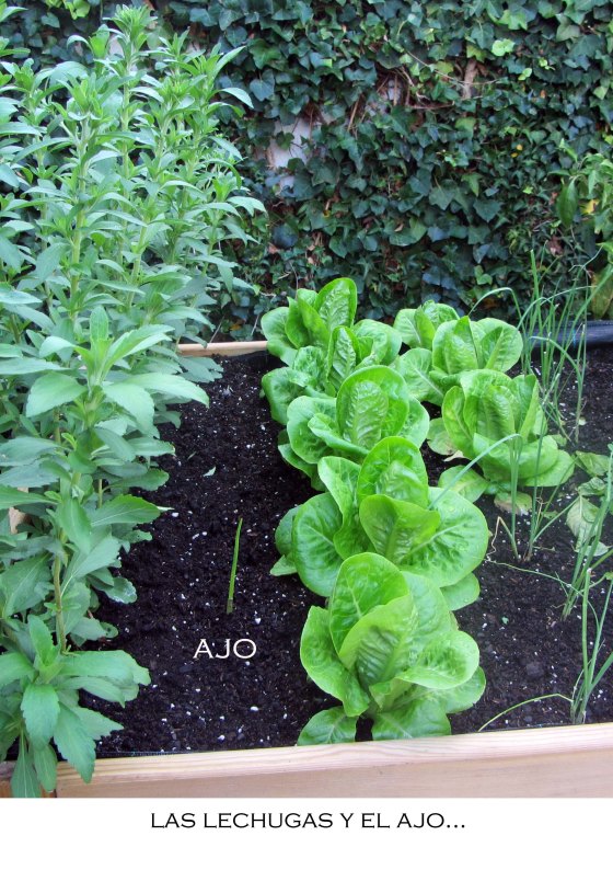 Y es que el ajo me sigue llamando pero la cosa va lenta. Tras la plantación de las cabezas, sólo ha aparecido un tallito rebelde y, de momento, de los demás, ni rastro. En cambio, los cogollitos de lechuga, han ido creciendo y adquiriendo un tono verde precioso que es una alegría verlos…