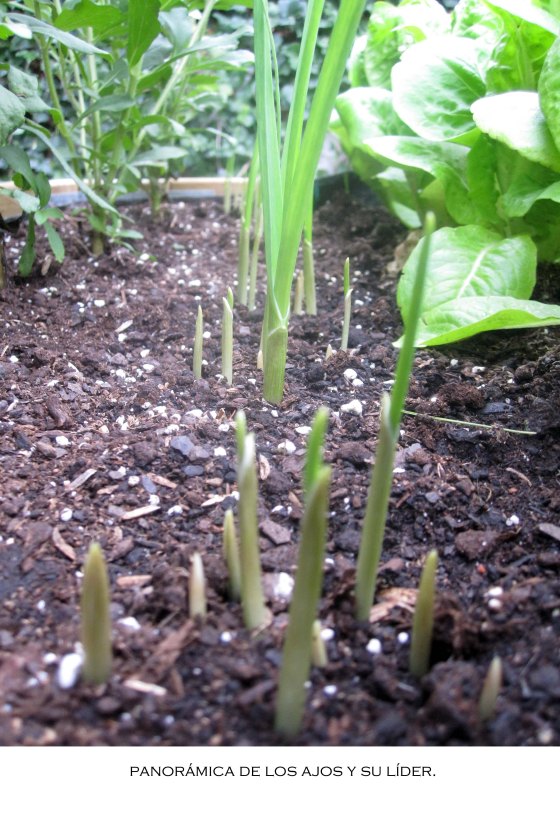Los ajos, que parecían pacíficos, empiezan a emerger de las profundidades de la tierra…Ya nacen agrupados, para ser más fuertes, aunque se ve claramente que hay un líder que domina toda la franja del ajo.