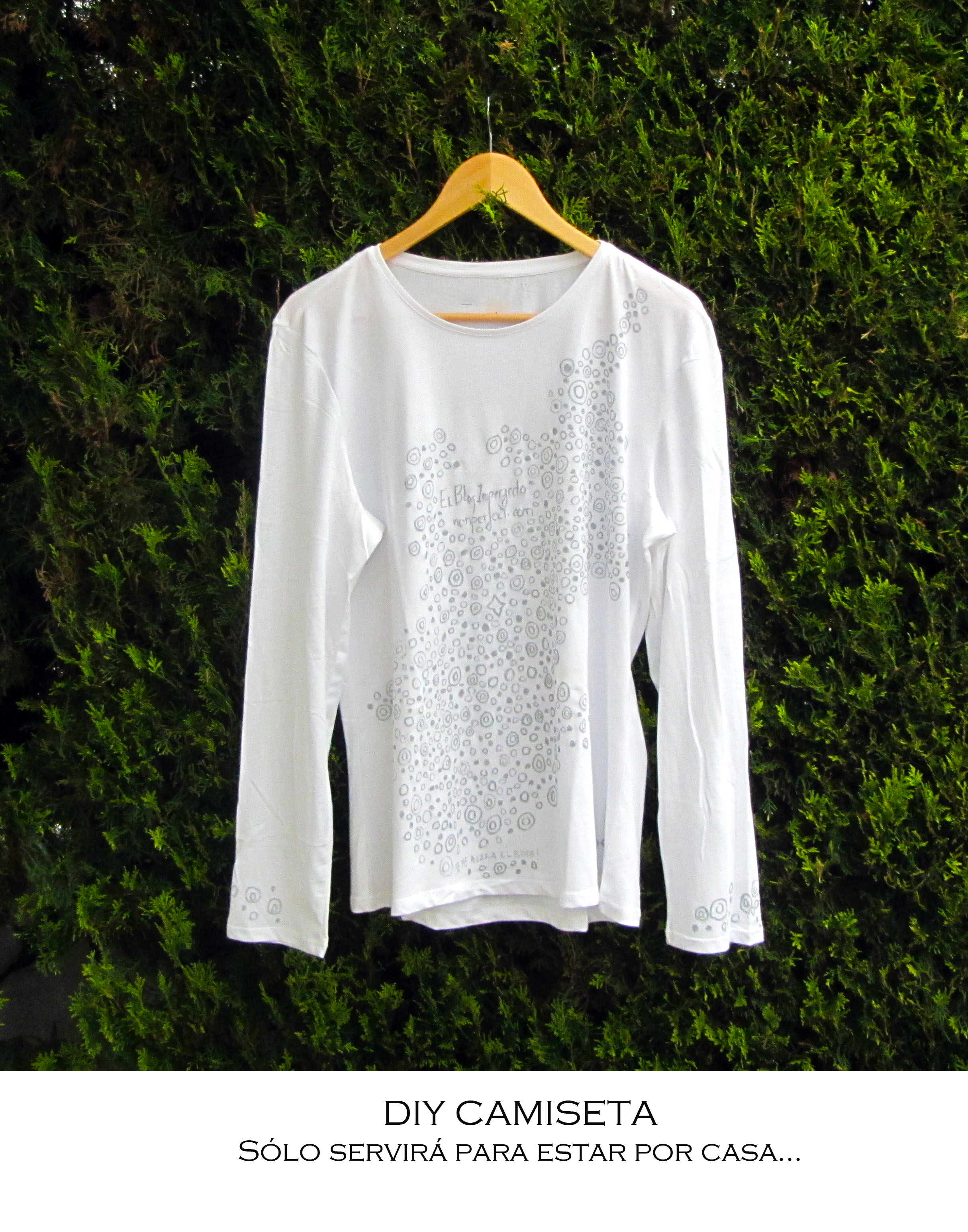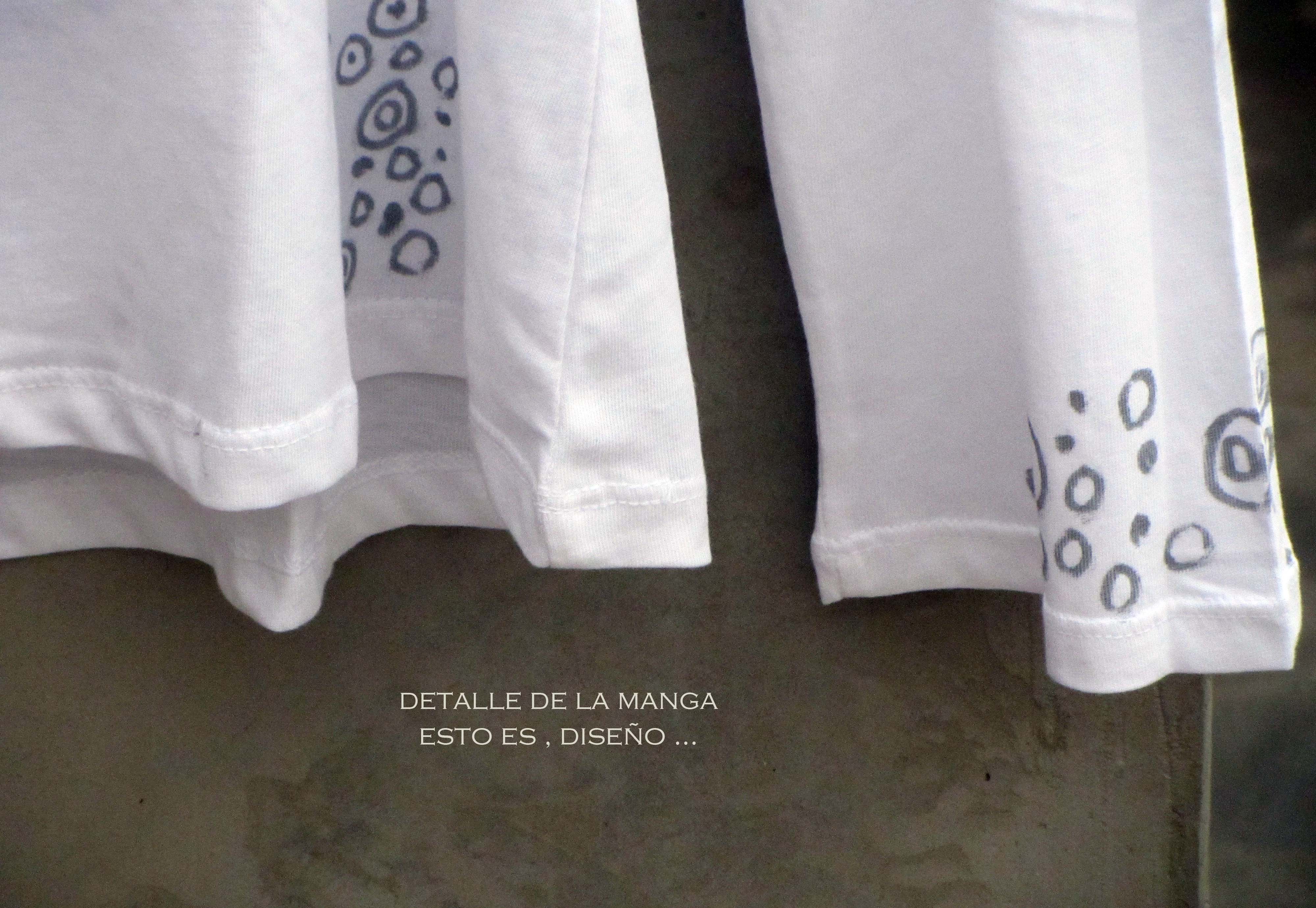 Y voy y le hago caso y la pinto. Al principio, con unos cuantos de esos  circulitos imperfectos, queda hasta mona. Me voy animando y, al final, convierto a la pobre camiseta en esto.