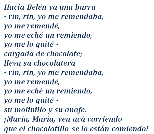 Ande, ande,ande, la Marimorena, ande, ande, ande que es la Nochebuena “. La Marimorena iba andando, o la obligaban a andar mientras tanto hacia Belén iba “una burra, rin, rin, yo me remendaba , yo me remendé, yo me eché un remiendo, yo me lo quité, cargada de chocolate” , hecho que muchos han interpretado como un claro mensaje entre narcotraficantes ( en clave).