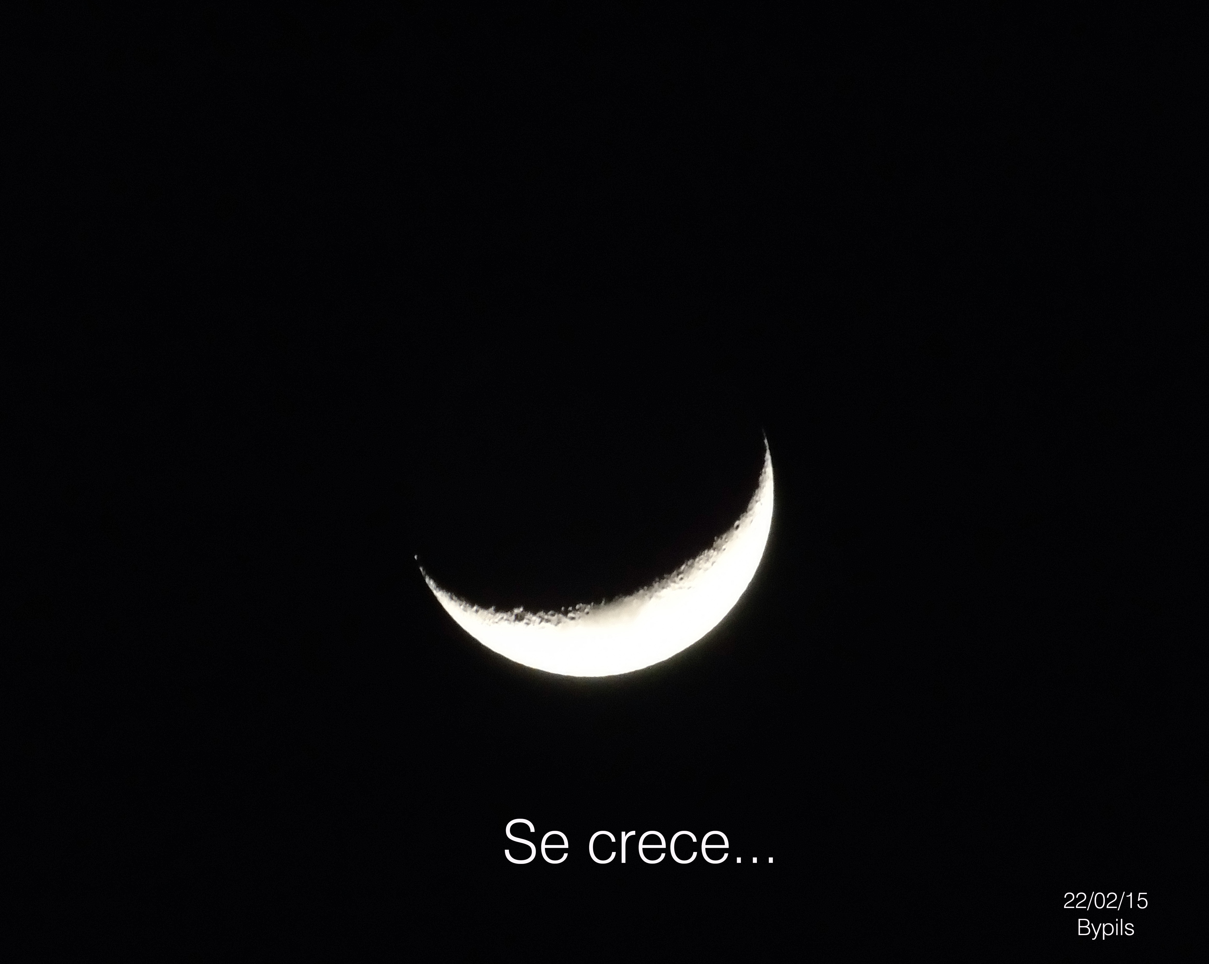 La luna creciente de hoy. Publicado el 22 febrero, 2015 por bypils 4 Viéndola brillar así, me parece mentira que sea oscura, casi negra como el carbón. Y se está viniendo tan arriba ( demasiada foto, demasiado observación.) que en fase creciente al 19%, hay tanta luz que con mi cámara veo toda la luna. Tu voto:Compartir, imprimir y bla, bla, bla... Haz clic para enviar un enlace por correo electrónico a un amigo (Se abre en una ventana nueva) Correo electrónico Haz clic para imprimir (Se abre en una ventana nueva) Imprimir Haz clic para compartir en Reddit (Se abre en una ventana nueva) Reddit TweetCompartir en TumblrMe gusta Cargando... Relacionado