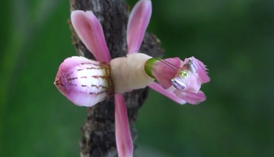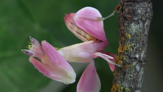 Esta es una especie de Mantis “Orchid Mantis”, que se camufla cambiando su color y simulando ser una orquídea…