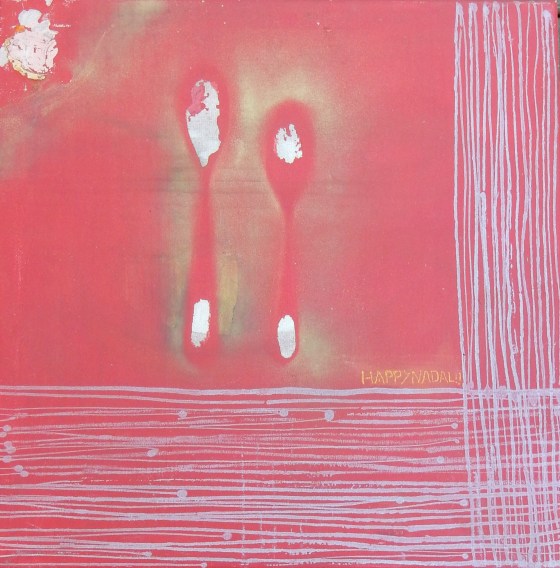 Elegí un lienzo de 60x60cm para reciclar. Cuadradito y no muy grande. Creo que lo pinté en las navidades del 2012. Se titulaba Happy Nadal y le pegué dos cucharas de madera y unos galets…