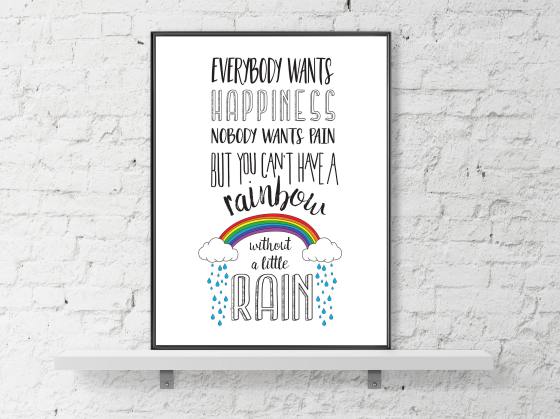 Y , la verdad, de la mayoría no me acuerdo… En uno de esos apuntes ponía : felicidad/dolor /lluvia/arcoíris. Esta sí la he recordado .La leí un mal día (mejor dicho, la» ví «porque era una de esas frases «visuales» que abundan en Pinterest ) y, tal vez, muy sensibilizada ante el desastre de jornada que me estaba regalando la vida , me pareció esperanzadora y mi cerebro se agarró a ella como un clavo ardiendo.