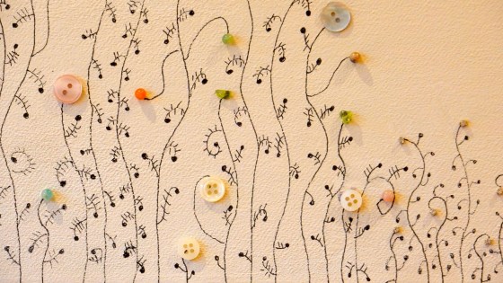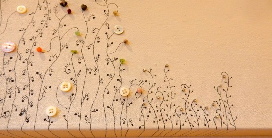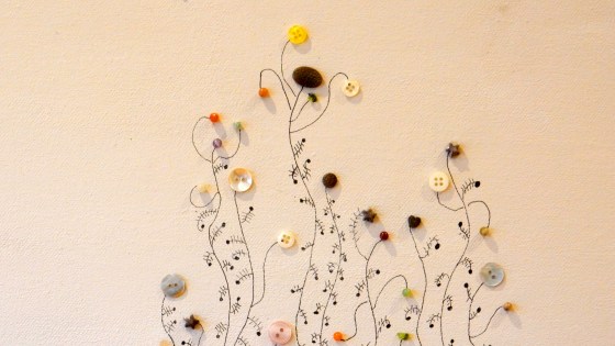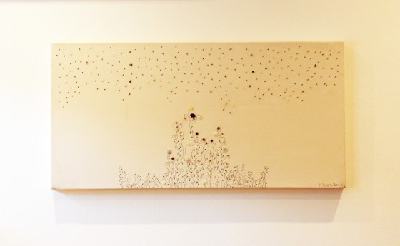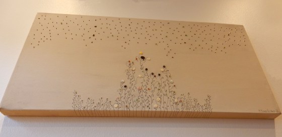 Estos “restos” son cuentas de pulseras y collares, botones y cualquier cosa susceptible de ser pegada en un cuadro que fui recogiendo en una cajita cuando me dediqué a ordenar todos los cajones de mi casa en un episodio Kondo muy intenso.