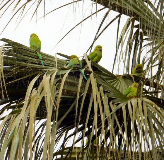 Piaban de forma muy ruidosa y hemos levantado la mirada. ¡Qué pájaros tan bonitos! Son de color verde…Incluso ha habido un comentario de experto : deben ser una especie tropical y en esa palmera han encontrado lo más similar a su entorno.