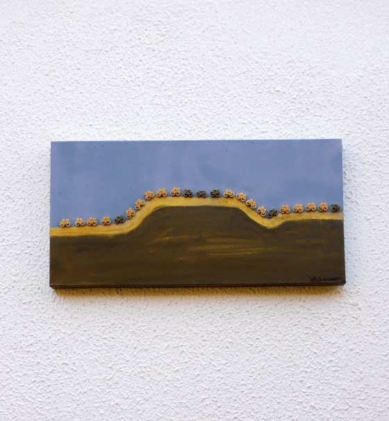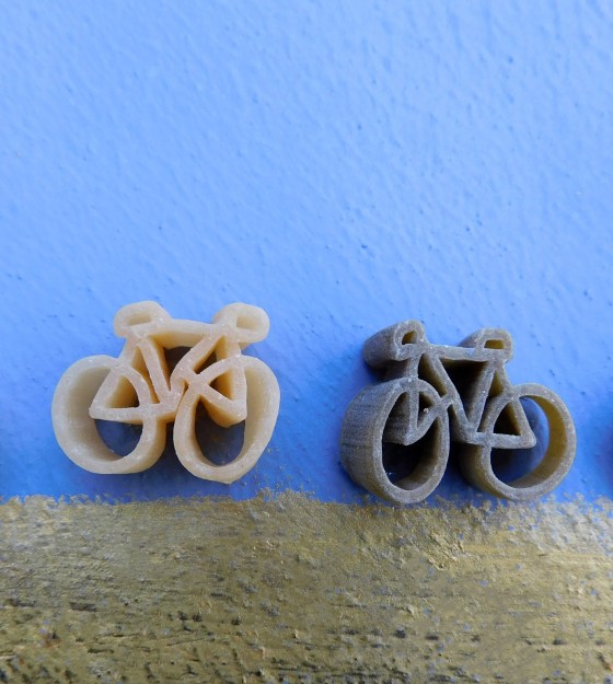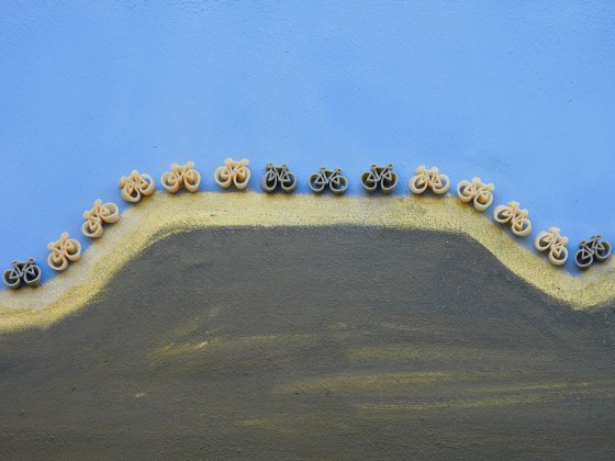 La idea aparece cuando descubro, en mi caja de “cosas para pegar a cuadros”  una pasta de sopa que adquirí en Amsterdam hace muchos años, porque tenía la forma de unas bicicletas. Ya la compré para utilizarla en los cuadros y no para hacer sopa…