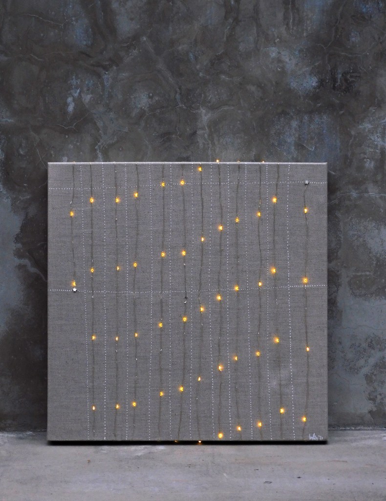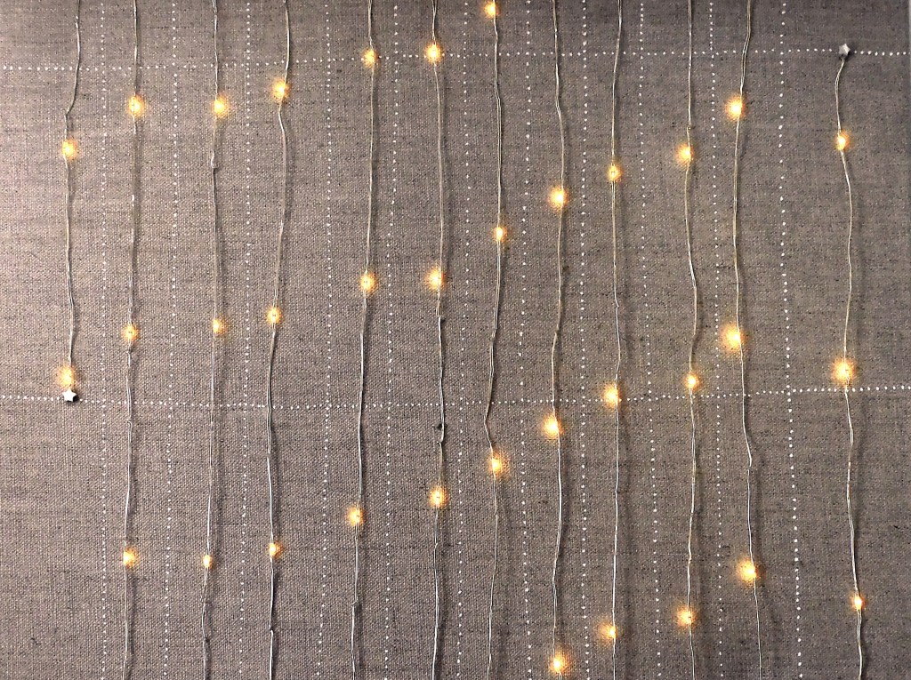 He utilizado una tira de led de hilo fino. Y, por fin, he podido usar una trozo de velcro con adhesivo que he estado guardando años en un cajón , por si acaso. Lo he pegado por detrás del bastidor para el soporte de las pilas ( así se puede sacar y cambiarlas). Es un portento de tecnología.
