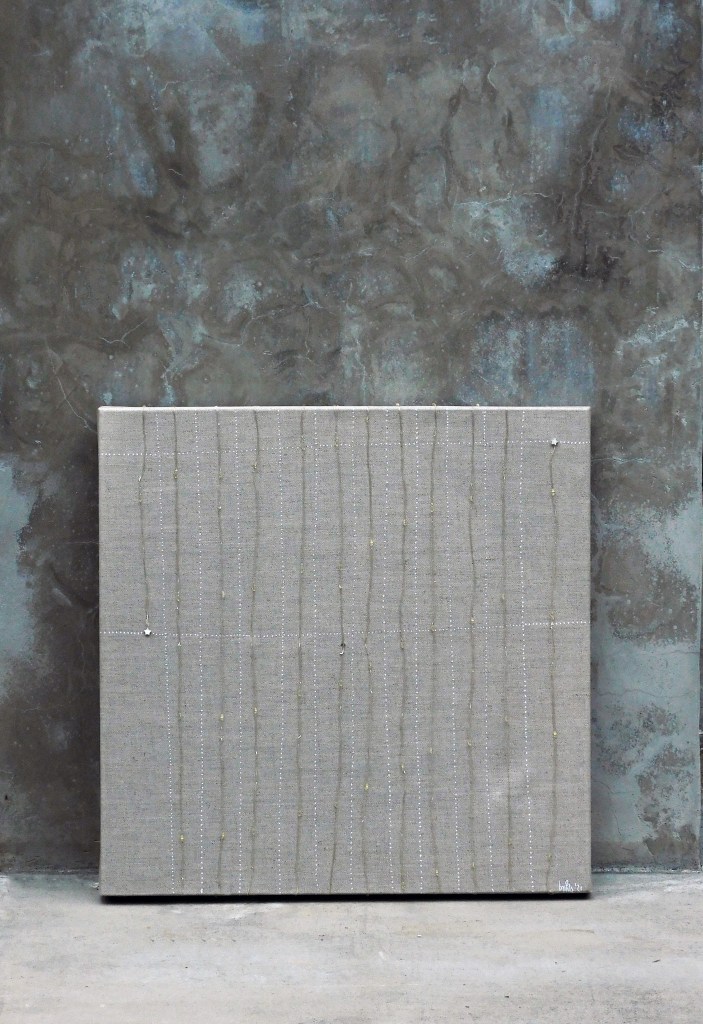 El bastidor es de lino de color crudo de 40 X 40 cm.