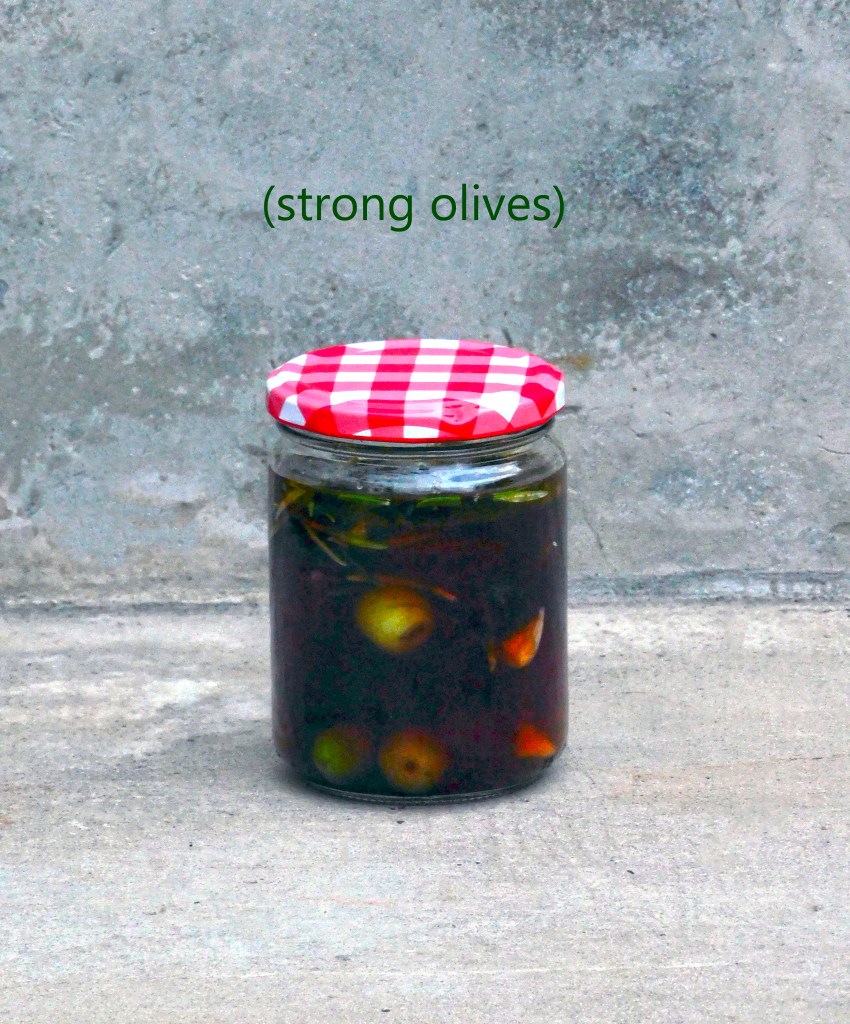 Strong olives. Publicado el 20 octubre, 2021 por bypils 0 Mis olivas van a ser una bomba de sabores fuertes. Tras estar en agua y sal ( con sus cambios pertinentes dos veces al día), ha llegado el momento de ponerlas a macerar. He puesto de todo : agua, vinagre, pimentón, ajo, tomillo y romero. Son dieciséis olivas, pero van a ser las más strong de esta zona del Mediterráneo. Tendré que buscar conejillos de indias… Tu voto:Compartir, imprimir y bla, bla, bla... Haz clic para enviar un enlace por correo electrónico a un amigo (Se abre en una ventana nueva) Correo electrónico Haz clic para imprimir (Se abre en una ventana nueva) Imprimir Haz clic para compartir en Reddit (Se abre en una ventana nueva) Reddit TweetCompartir en TumblrMe gusta Cargando... Relacionado