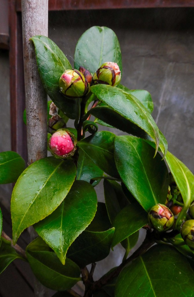 He hecho las fotos y al cabo de un rato, he visto un gorrión que movía las hojas de las plantas de las macetas, para hacer caer las gotas de lluvia y bebérselas.  Primero se ha dirigido a unos arbustos, pero después, le ha dado un meneo a la camelia y la flor ha caído al suelo.