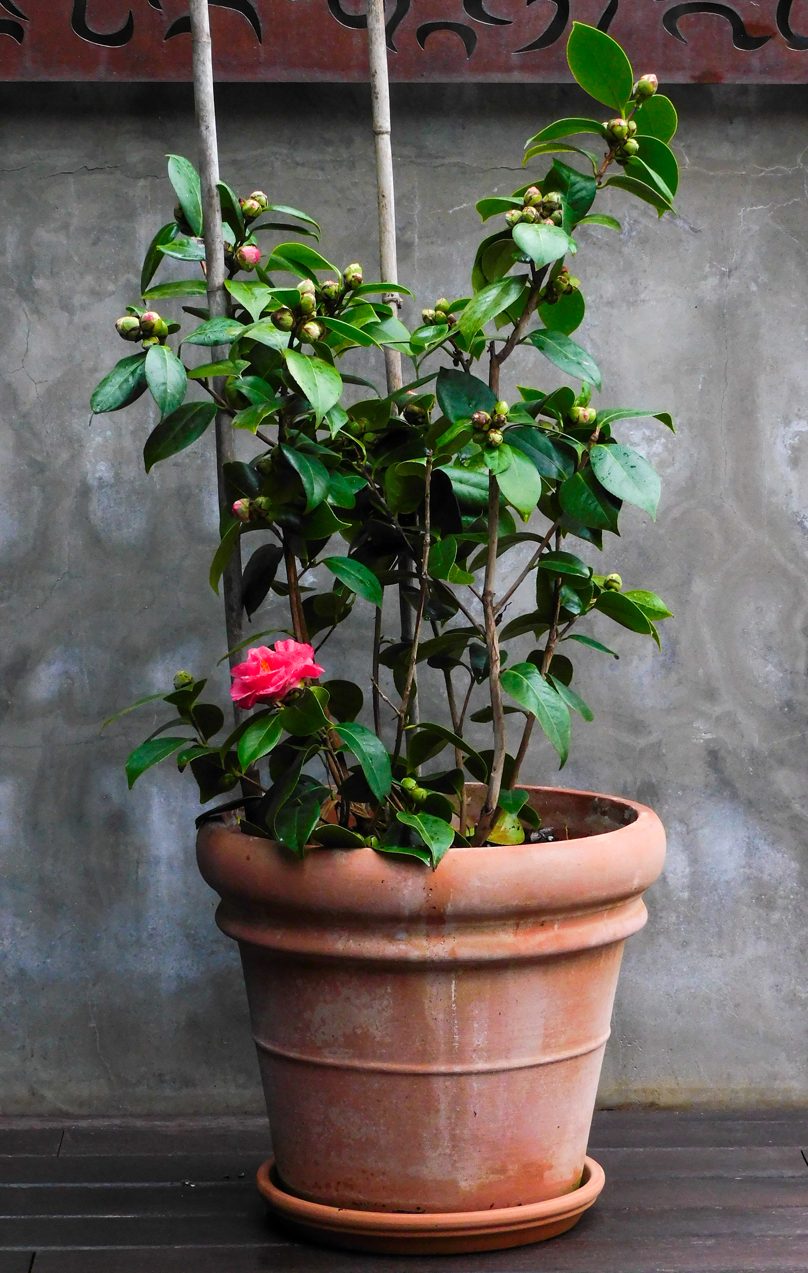 He hecho las fotos y al cabo de un rato, he visto un gorrión que movía las hojas de las plantas de las macetas, para hacer caer las gotas de lluvia y bebérselas.  Primero se ha dirigido a unos arbustos, pero después, le ha dado un meneo a la camelia y la flor ha caído al suelo.