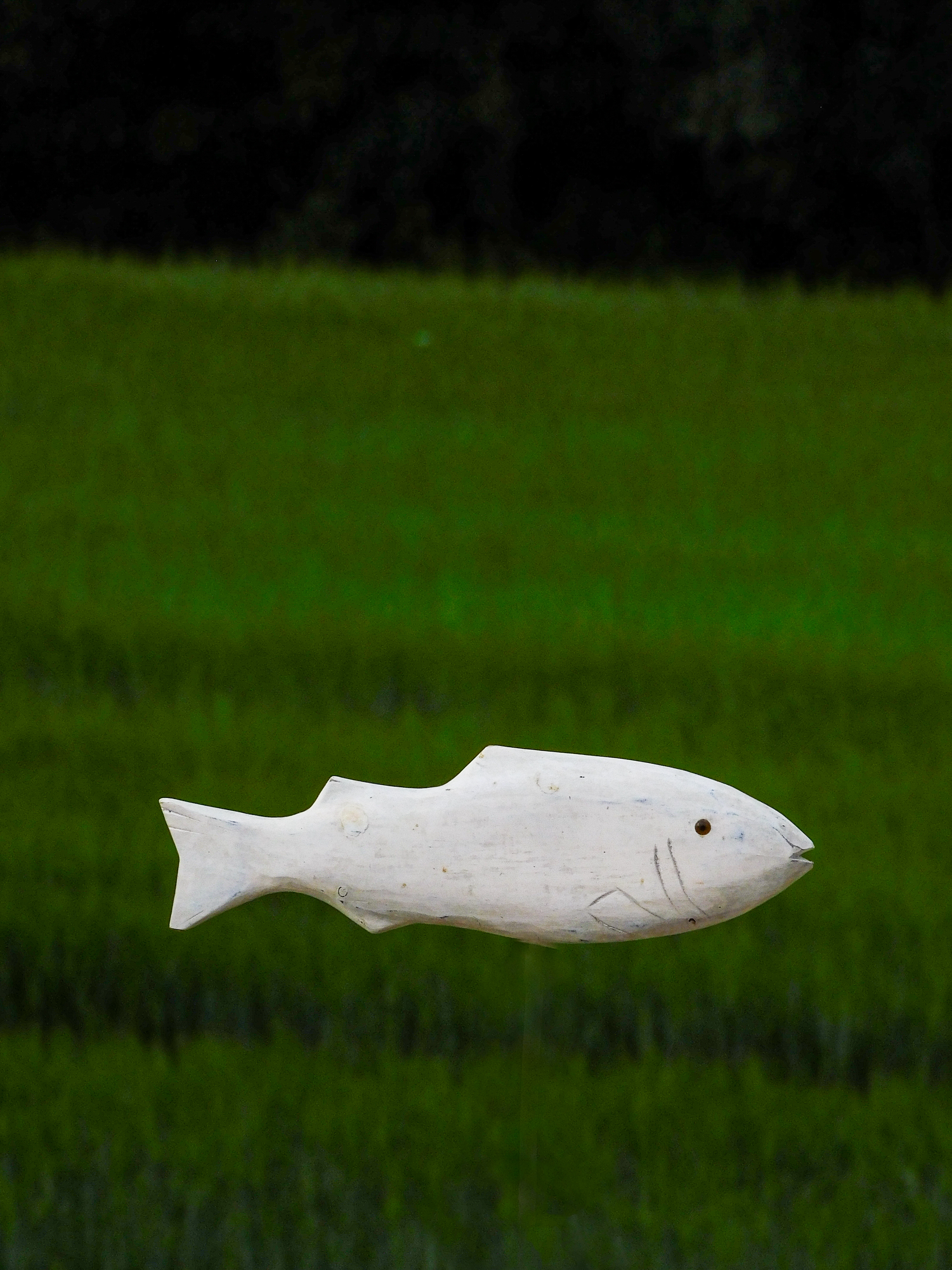 No sé qué habrán pensado los que están trabajando el campo, unos metros más allá. Una persona colocando un pez de madera para una sesión fotográfica…