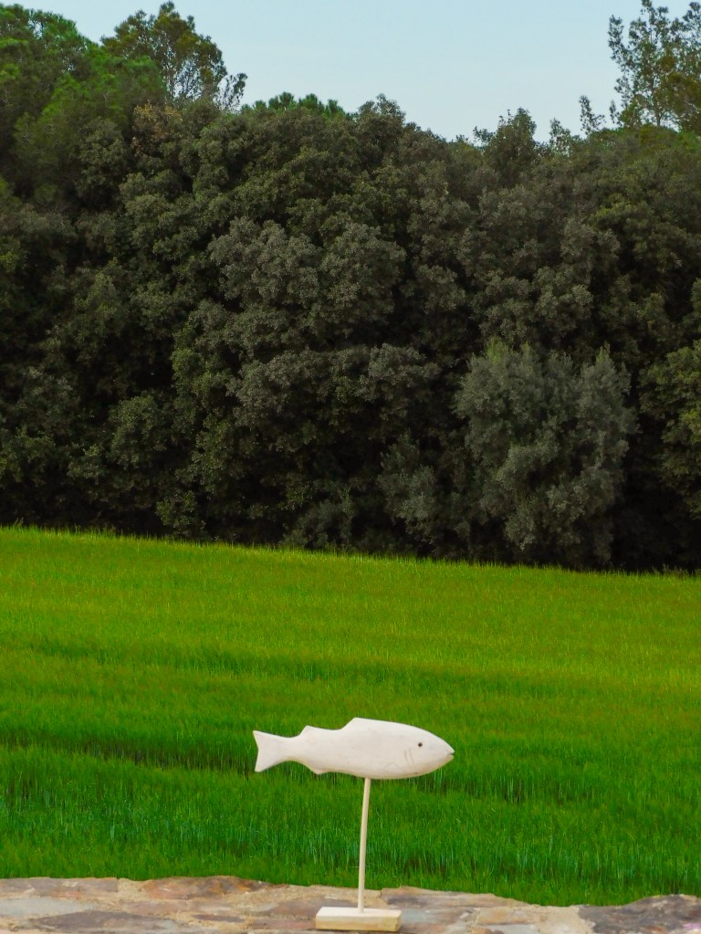 Tengo un pez de madera blanca que me traje de Formentera. En mi mente, ya veo la foto que ilustra este post. Voy a buscar el pez y lo coloco en un lugar en el que el viento no lo tumbe y se vea el fondo de ese océano vegetal. Hago las fotos, otra cosa que me divierte y me relaja.
