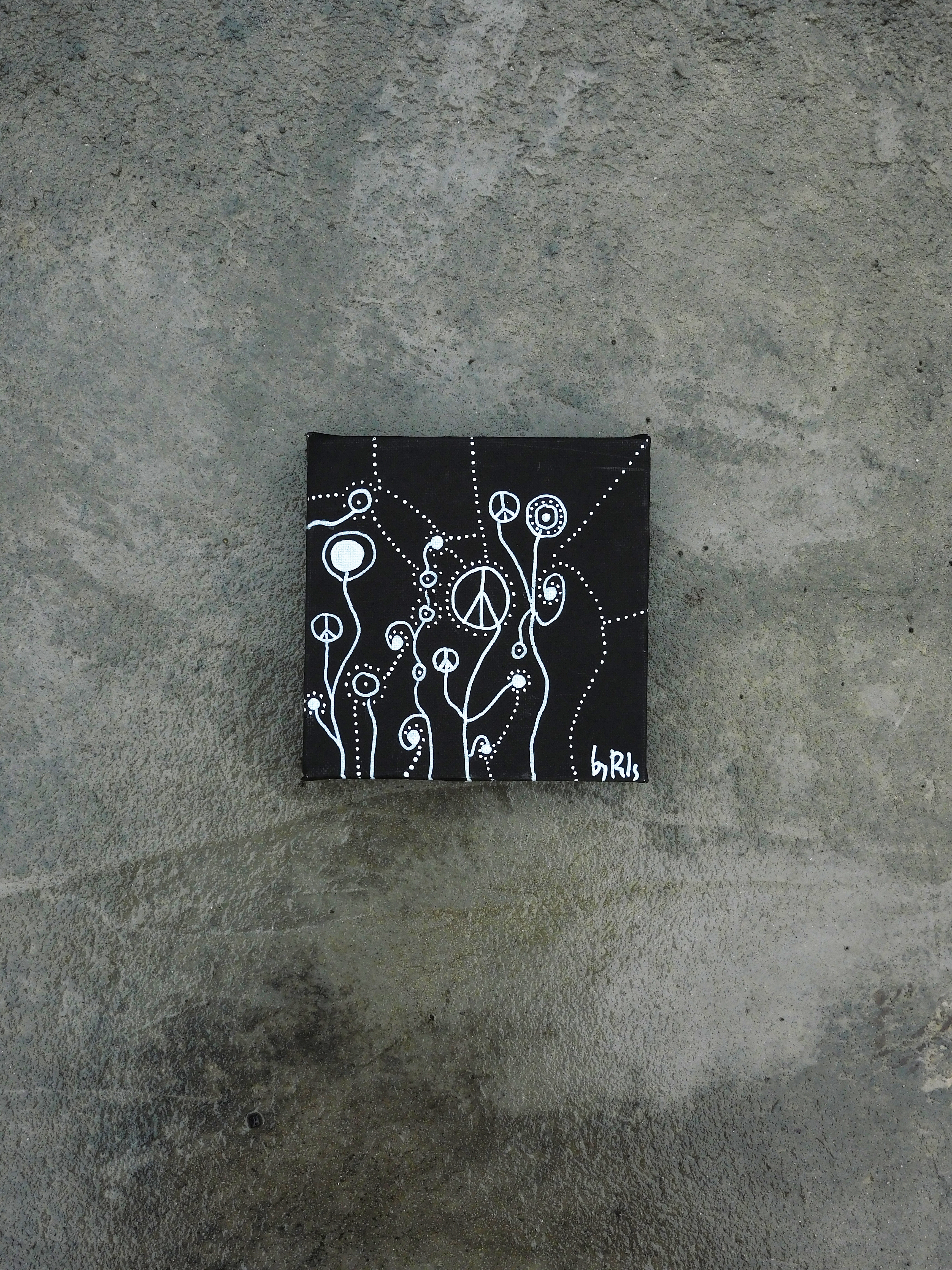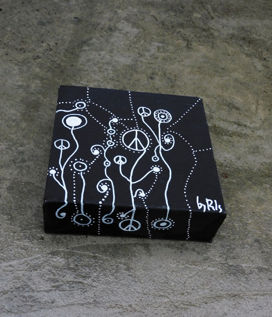 A este extraño jardín, lo llamé flores marcianas. Lo he encontrado, escondido en un cajón. Es un bastidor muy pequeñito, con un fondo de pintura de pizarra negra y unas flores blancas. Algunas de ellas, son el símbolo de la paz que todos conocemos.