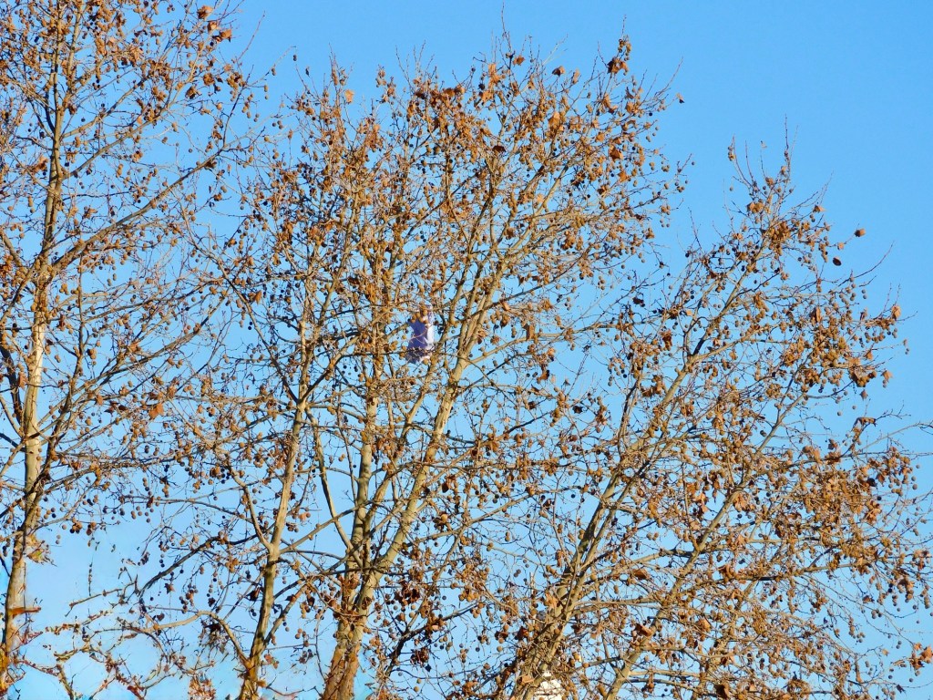 En invierno, los plataneros se quedan como esqueletos elegantes: ramas desnudas, cielo limpio y esas bolas cargadas de polen, esperando la primavera.