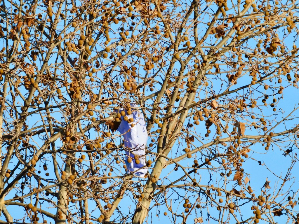 Estos días se han balanceado con frenesí por el episodio de viento fuerte que hemos tenido en la zona. Mirando su baile, de repente vi algo blanco colgado en lo alto de las ramas.