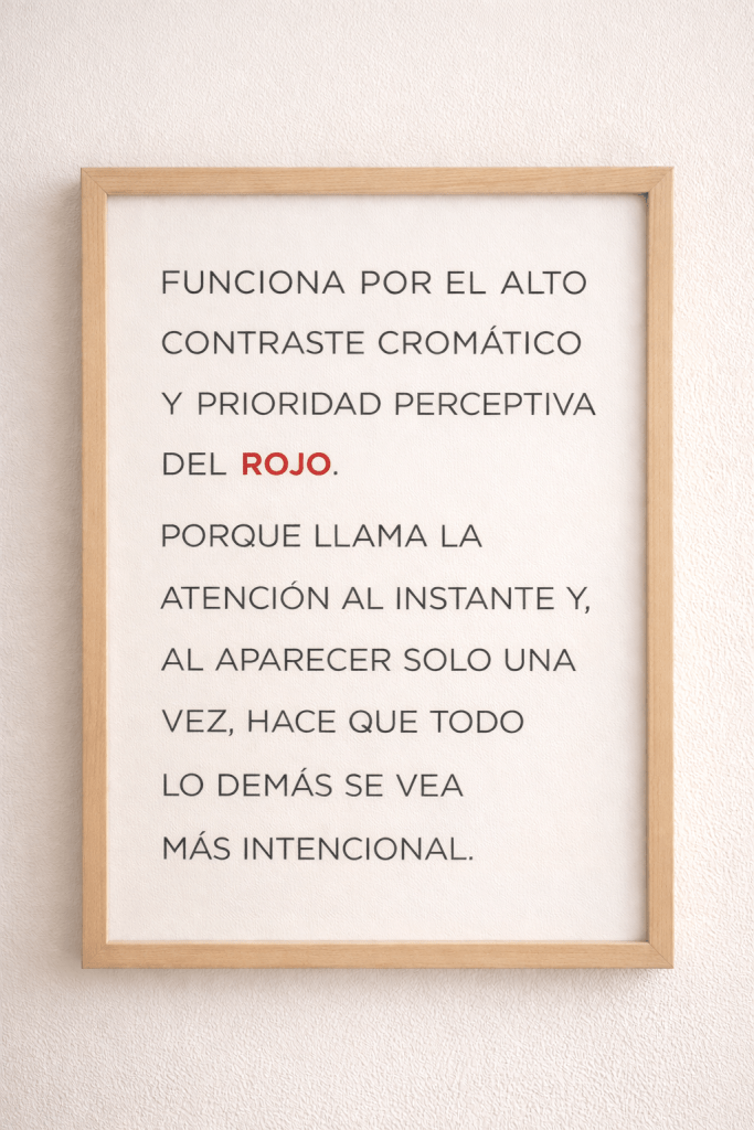 Consiste en introducir un toque de rojo intenso en un conjunto neutro o contenidosin que el rojo esté “justificado”por la paleta principal. No es un rojo protagonista ni estructural: aparece de forma casi accidental, pero lo cambia todo.