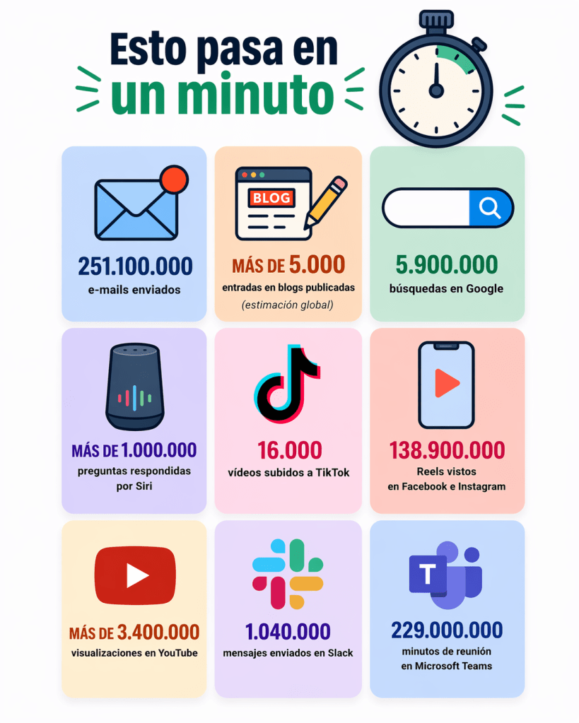 En este mismo minuto, aproximadamente, se han enviado 251.100.000 e-mails. Se han realizado 5.900.000 búsquedas en Google. Siri ha respondido más de 1.000.000 de preguntas. Se han subido 16.000 vídeos a TikTok. Se han visto 138.900.000 Reels en Facebook e Instagram. YouTube ha sumado más de 3.400.000 visualizaciones. Y Microsoft Teams ha acumulado 229.000.000 de minutos de reunión.