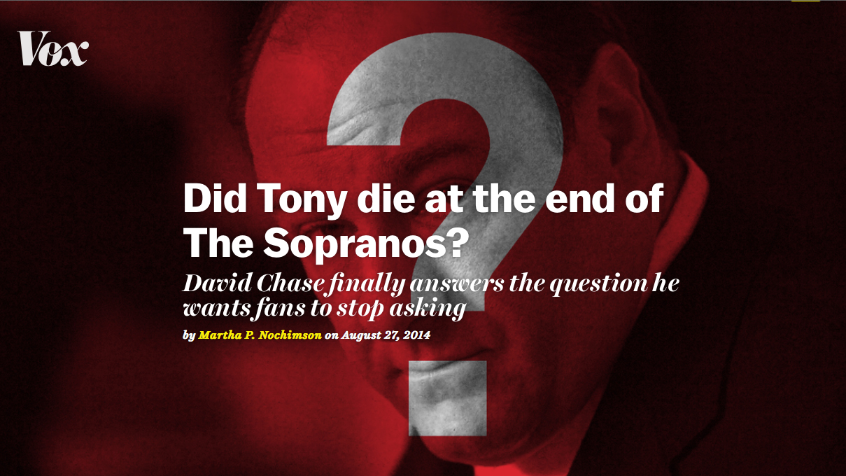 “Si el personaje interpretado magistralmente por James Gandolfini acaba o no acaba muerto siempre ha sido una de las preguntas más recurrentes entre los fans y, en una reciente -y viral- entrevista con ‘Vox’, el creador de la popular serie David Chase se ha atrevido, por fin, a arrojar un poco de luz sobre el asunto. Según expone la autora Martha P. Nochimson en el interesante artículo, el guionista respondió de la siguiente manera cuando le preguntó si Tony moría en el final: «Dijo que no con la cabeza. Y simplemente respondió, ‘No». (Sensacine.com)