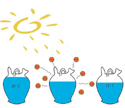 La clave del enfriamiento está, por lo tanto, en la evaporación del agua exudada, ya que ésta, para evaporarse, extrae parte de la energía térmica del agua almacenada dentro del botijo. (Wikipedia, dixit)