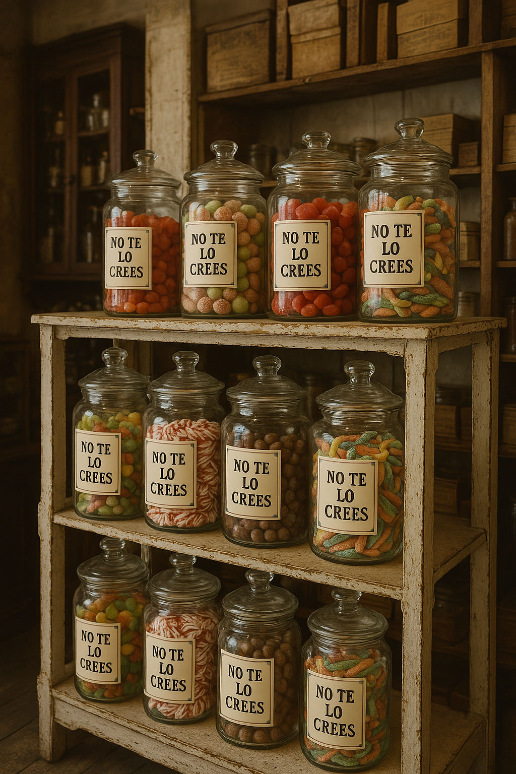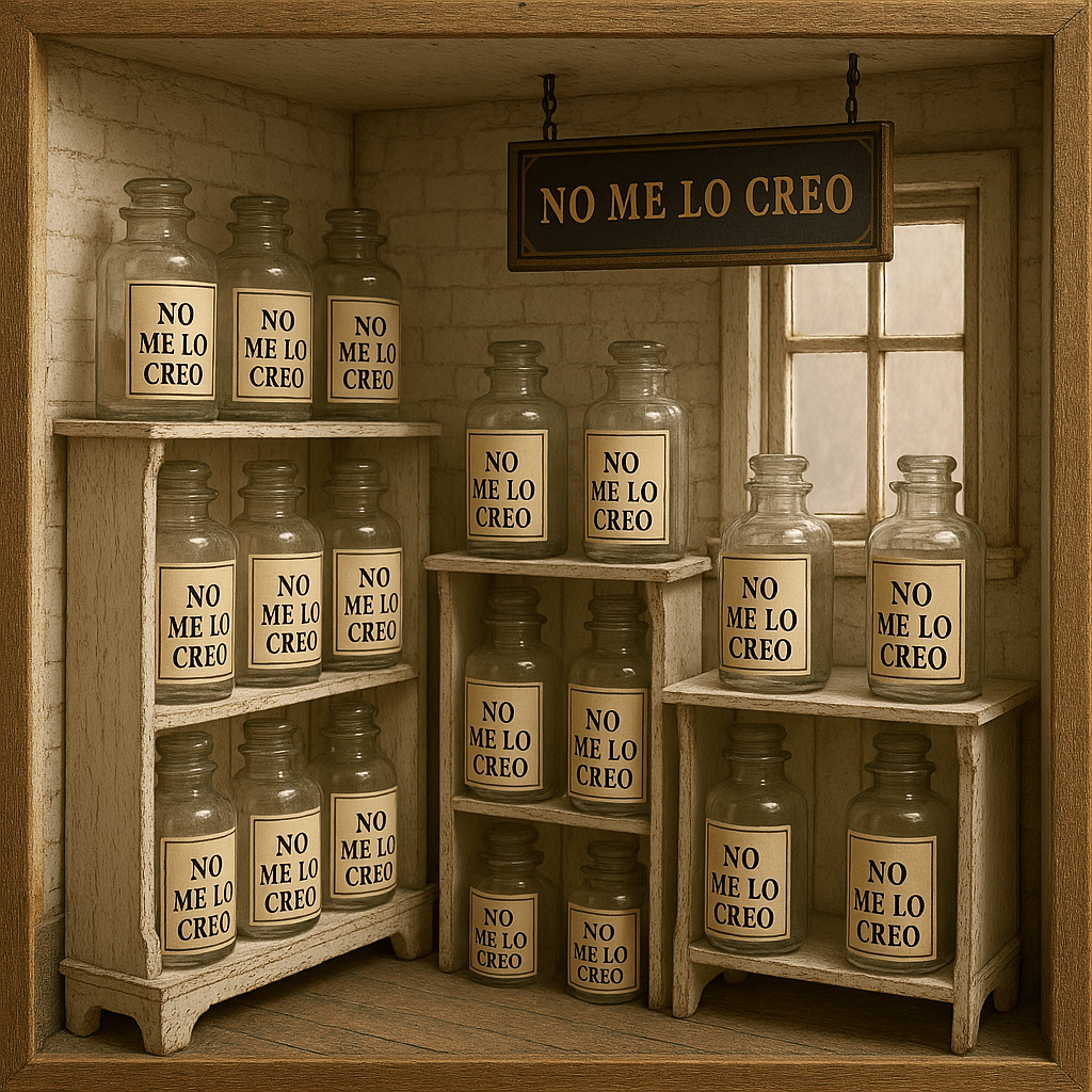 Cuando me dijeron que existía esa tienda, no me lo creí. Tampoco me creí las instrucciones: si conoces la ubicación —que es efímera y cambia constantemente—, debes ir al lugar exacto. Una vez allí, no todo el mundo ve lo mismo. No me preguntéis por qué; nadie lo sabe. La teoría que circula es que la tienda detecta si, de verdad, crees en lo que allí se vende. Si es así, la tienda se llama “NO ME LO CREO”, y los frascos contienen un ingrediente secreto que te permite no creer en nada de lo que te indigna o te duele. Si vas en plan escéptico, el rótulo reza “NO TE LO CREES” y, en los frascos, solo hay golosinas. Así que, si eres un crédulo honesto y has conseguido uno de los frascos, ya puedes vivir tranquilo. Yo soy el ejemplo. Me dices que me haga con un kit de supervivencia por si hay una guerra, y no me lo creo. Me dices que unos cuantos locos idiotas gobiernan el mundo, y no me lo creo. Me dices que nunca habrá paz, y no me lo creo. No me digas nada que me duela, porque como no me lo creo, no me preocupa.