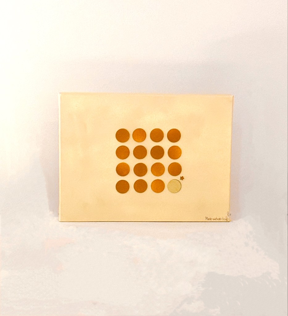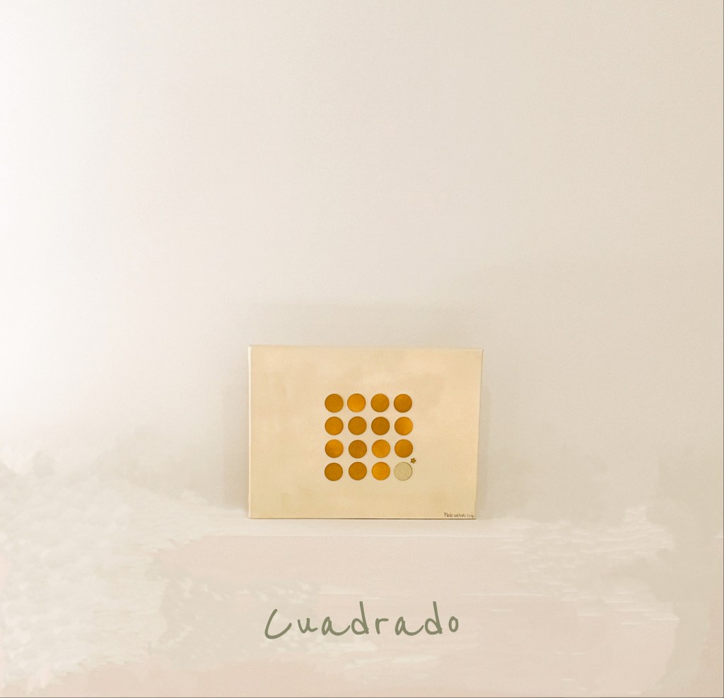 Coloqué las letras con cuidado. Sin embargo, al añadir los puntos de las “i”, que no existían, la “m” se movió, y también un poco la “n”. El pegamento era tan fuerte y rápido que no pude corregirlas. Ahora, no hay quien las mueva sin romper la tela del bastidor. No sé si repetiré este experimento, pero ya tiene un título.