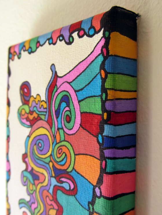 Estoy en mi cuadro…Quiero salir. Lo recorro , de arriba a abajo. Me paseo por todos los círculos. Sigo las franjas moradas. Me cuelgo del borde. Nada.