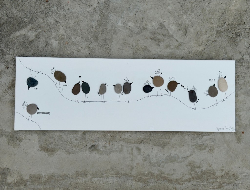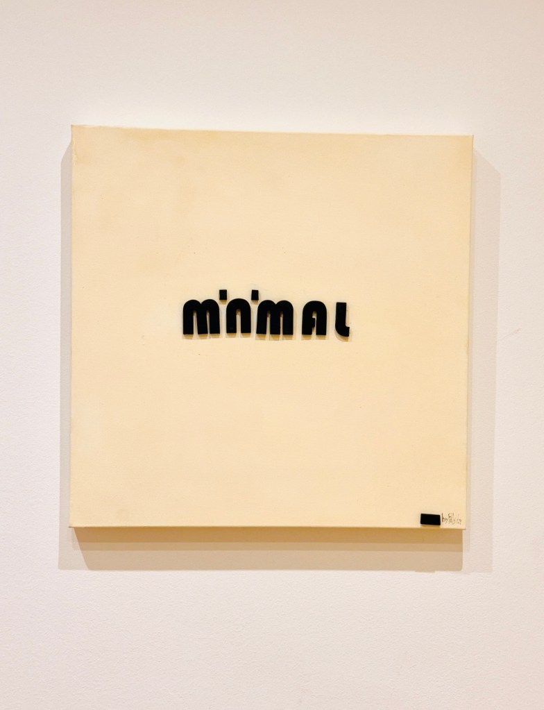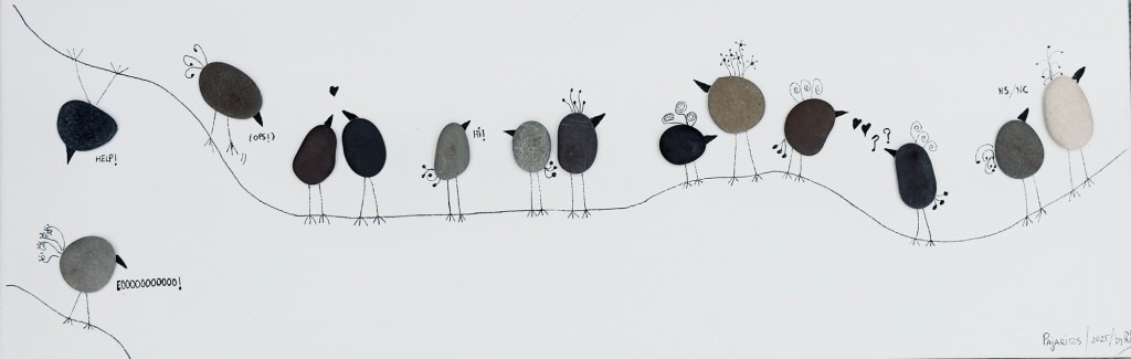 Coloqué las letras con cuidado. Sin embargo, al añadir los puntos de las “i”, que no existían, la “m” se movió, y también un poco la “n”. El pegamento era tan fuerte y rápido que no pude corregirlas. Ahora, no hay quien las mueva sin romper la tela del bastidor. No sé si repetiré este experimento, pero ya tiene un título.