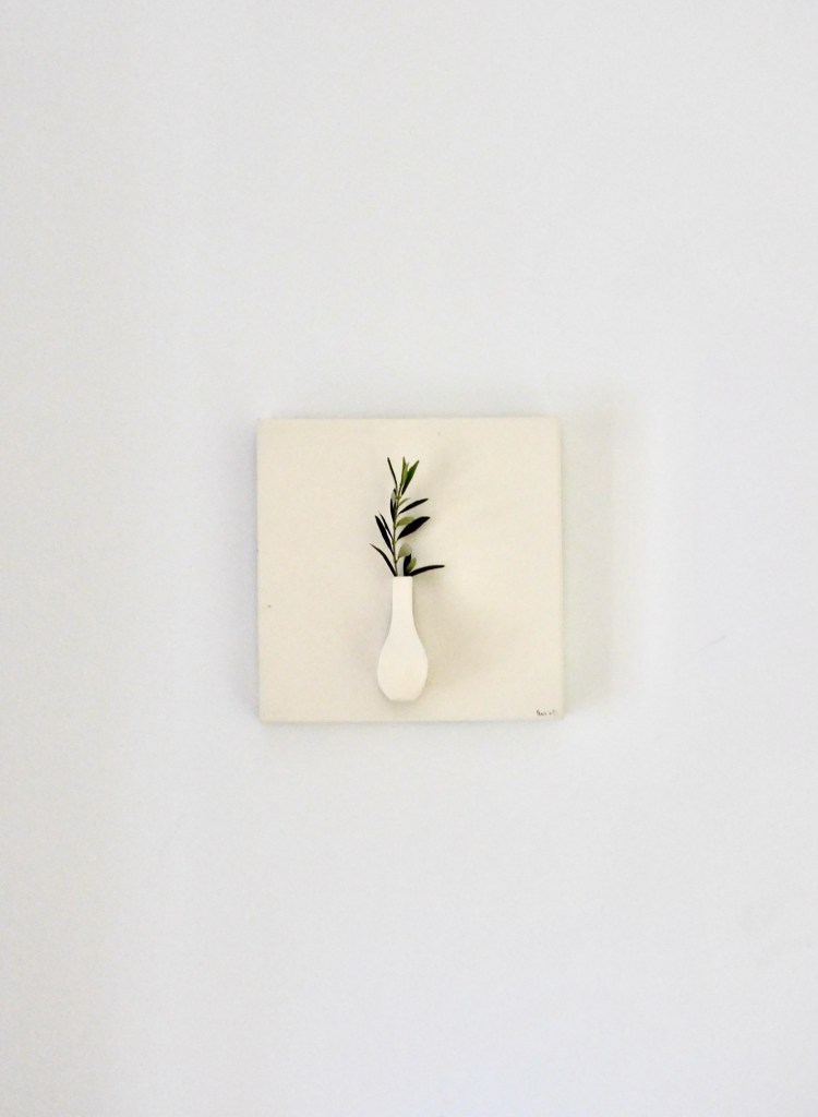 Para acompañar la obra, se creó un ramo escultórico que dialoga con el cuadro. Una botella de vidrio fue pintada a mano con pintura de pizarra en tono beige, generando una base sobria y mate. Las ramas secas fueron también pintadas cuidadosamente, en la misma gama, para integrarse en una composición armónica y monocromática. Como gesto final, uno de los farolillos fue integrado en el centro del ramo, como un eco tridimensional del motivo floral del lienzo.
