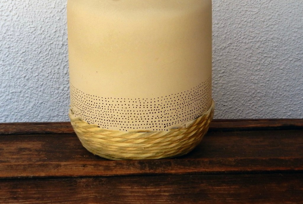 Pinté una botella de vidrio con pintura de pizarra beige. También pinté las ramas secas para que todo respirara la misma calma. En el ramo, coloqué otro farolillo como un guiño al cuadro.
