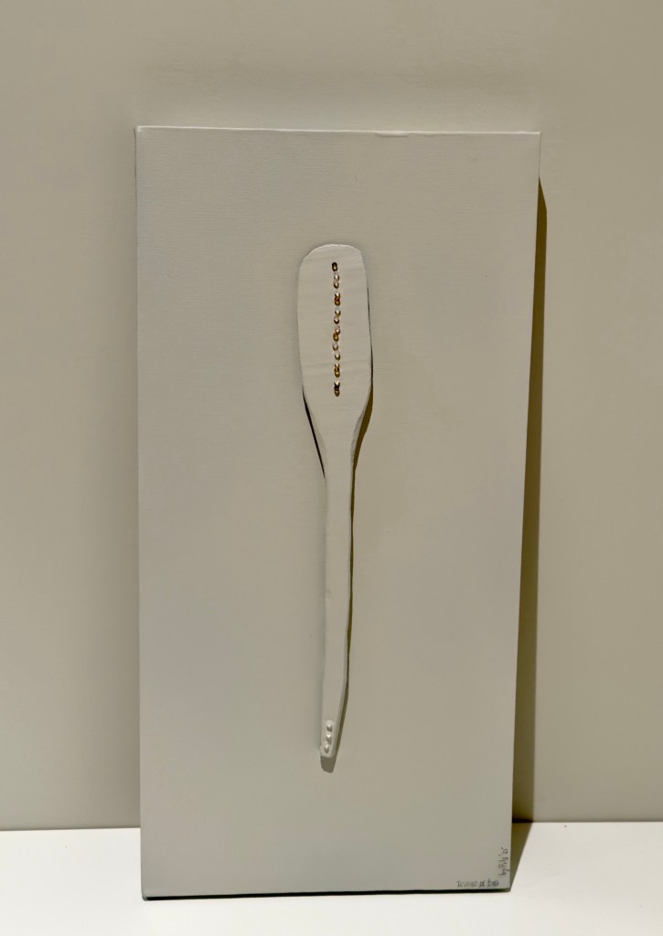 Vuelve a estar en mi despacho, pintado de blanco pizarra y con una intervención en pintura de relieve color oro, para ser fiel al concepto del Kintsugi . Cuenta una historia, llena de afectos y dice , en blanco y oro,  lo mucho que echo de menos a mi padre.