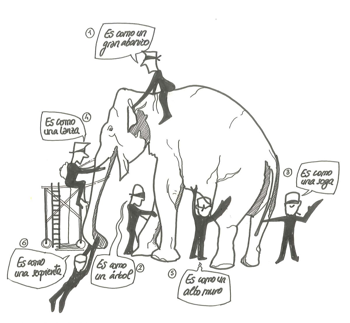 (*) “Seis hindúes sabios, inclinados al estudio, quisieron saber qué era un elefante. Como eran ciegos, decidieron hacerlo mediante el tacto. El primero en llegar junto al elefante, chocó contra su ancho y duro lomo y dijo: «Ya veo, es como una pared». El segundo, palpando el colmillo, gritó: «Esto es tan agudo, redondo y liso que el elefante es como una lanza». El tercero tocó la trompa retorcida y gritó: «¡Dios me libre! El elefante es como una serpiente». El cuarto extendió su mano hasta la rodilla, palpó en torno y dijo: «Está claro, el elefante, es como un árbol». El quinto, que casualmente tocó una oreja, exclamó: «Aún el más ciego de los hombres se daría cuenta de que el elefante es como un abanico». El sexto, quien tocó la oscilante cola acotó: «El elefante es muy parecido a una soga». Y así, los sabios discutían largo y tendido, cada uno excesivamente terco y violento en su propia opinión y, aunque parcialmente en lo cierto, estaban todos equivocados.”