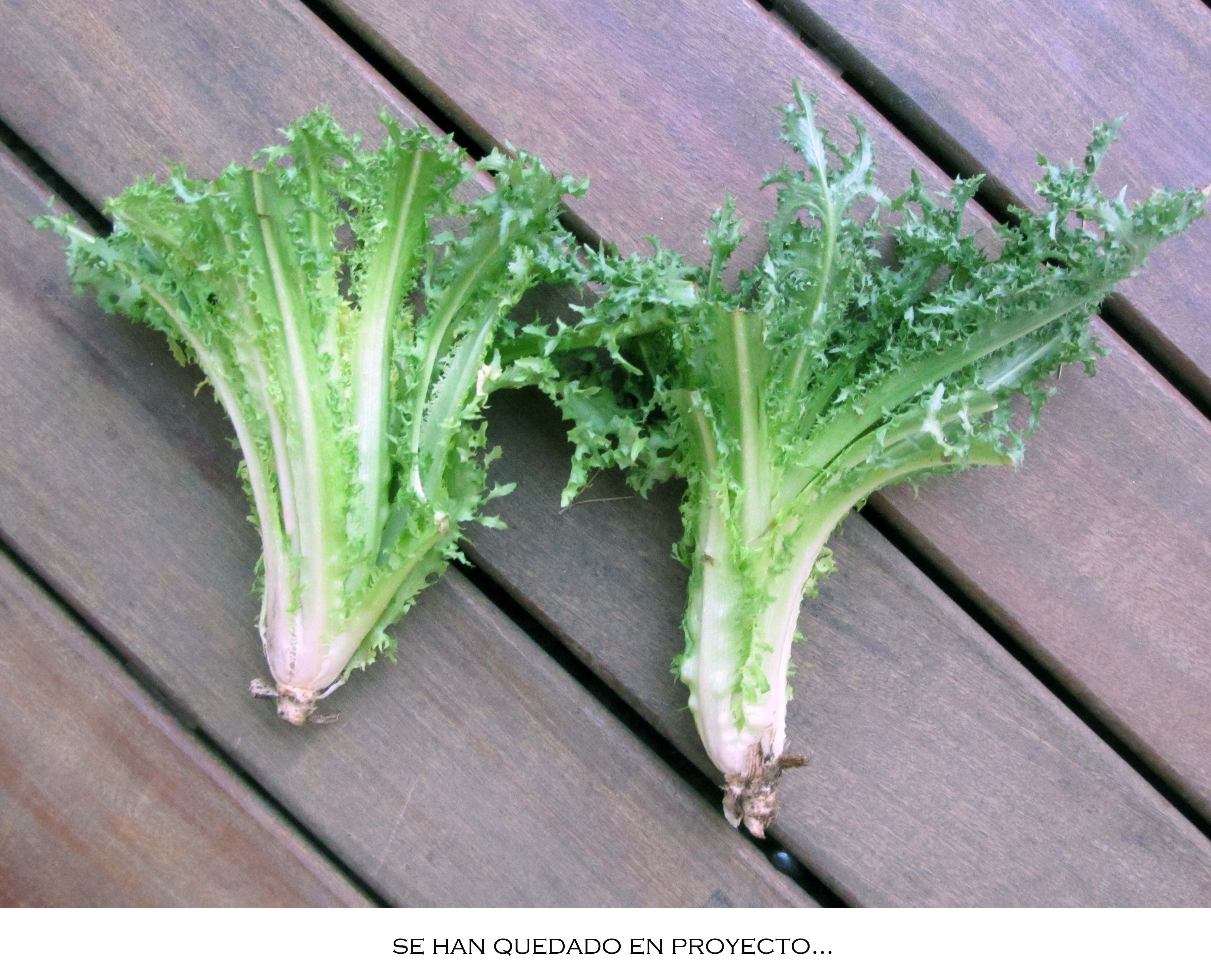 Otra cosa han sido las pobres escarolas que planté en maceta , que después até para que no se desparramarán y que , al final, se han convertido en unas pobres plantas , verdes, espigadas y raquíticas… Saben a clorofila amarga ¿?