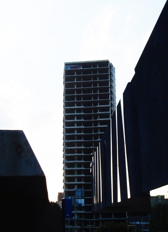 Estaba en el Parc del Fòrum, en Barcelona, antes de entrar a su precioso e increíble Auditori cuando levanto la vista y veo ese enorme edificio que se está construyendo. En su cima, en la parte más alta (imagino sin ascensor) me llama la atención un graffiti.
