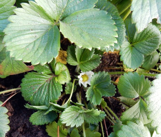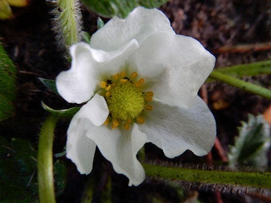No sé si prosperara, si será una fresa en el futuro, pero… ahí está. La flor del fresal, empezando…