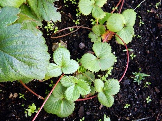 He decidido que la fresa campe a sus anchas. Ha desarrollado esos tallos que parten de la planta madre y que se llaman “estolones”.