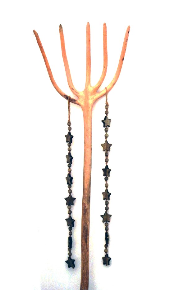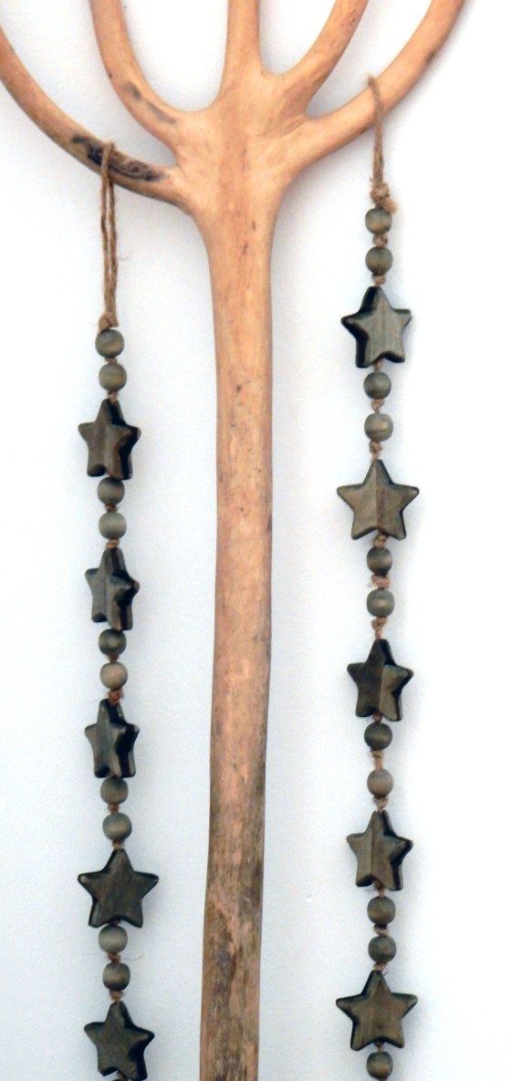 En la horca/forca que me traje del pueblo… Era para separar el grano de la paja en el proceso de trillar. Ahora decora mi casa y lleva colgadas dos guirnaldas de estrellas.
