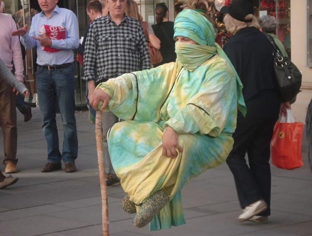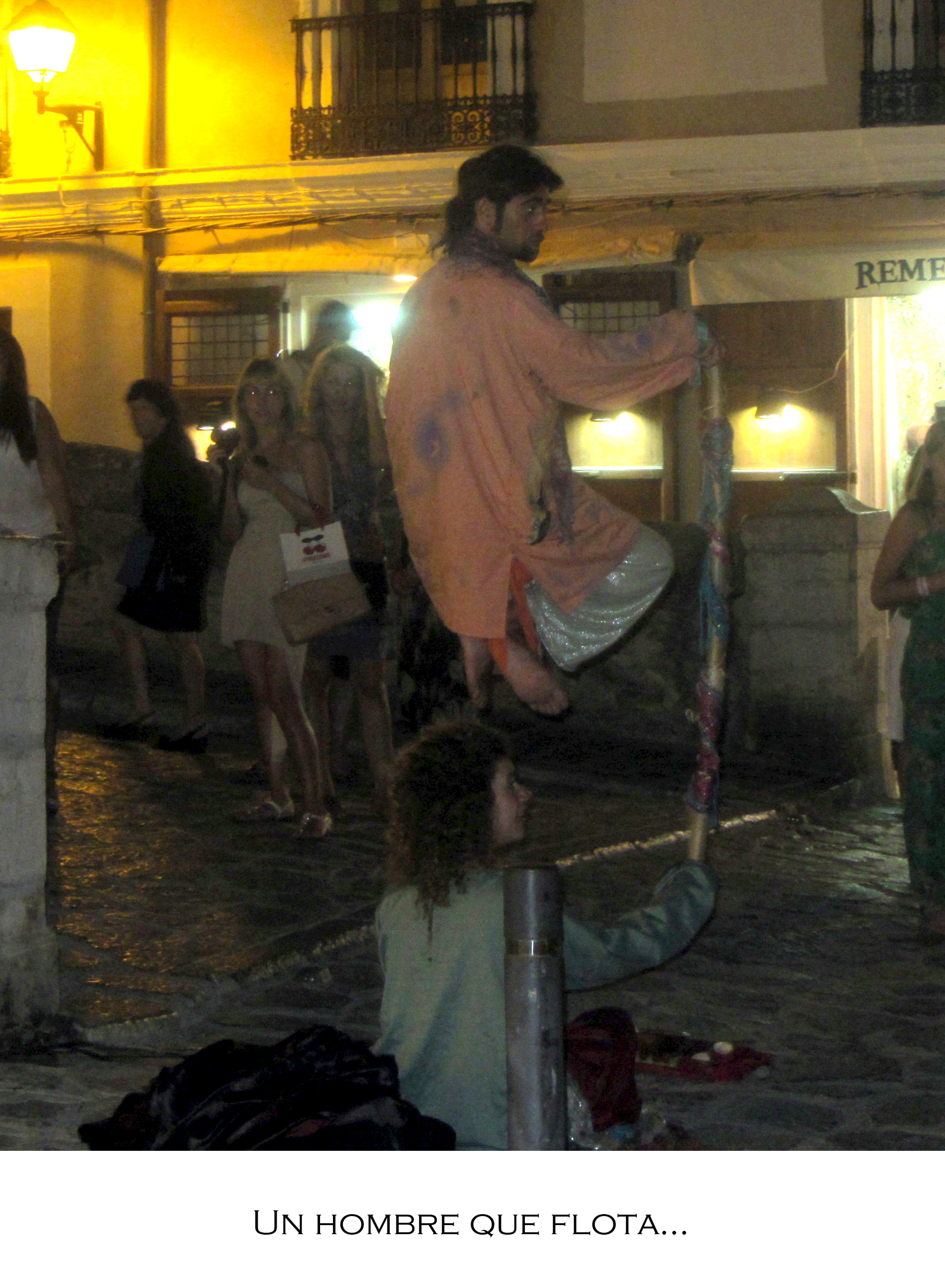 Una paseo de verano , por la Marina Vieja de Ibiza y…me encuentro a este tío , literalmente flotando… La gente se arremolinaba alrededor, observando -con ojos de halcón- para encontrar el truco. Los niños se acercaban y pasaban la mano por el aire, buscando algún mecanismo o algo…Algo. Tampoco es que le dediques un tiempo excesivo a “razonar” cómo consigue ese tío mantenerse en esa posición : buscas los indicios , no los encuentras y te quedas con la intriga… Sabes que no es posible actuar contra la fuerza de la gravedad así que…hay algo.