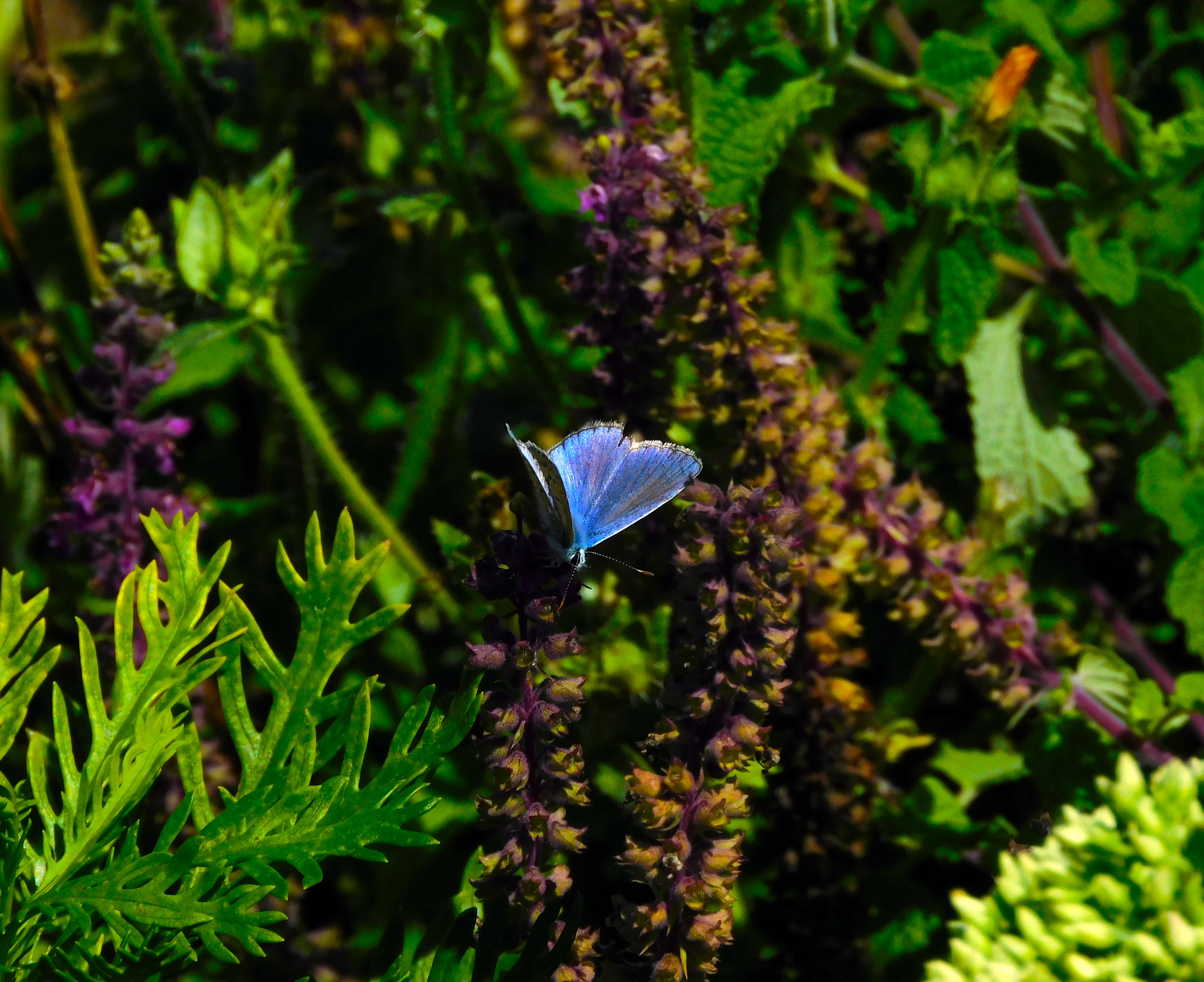 Hice unas fotos a una mariposa pequeñita de color azul.