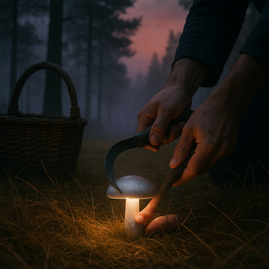 Mi instinto de buscador de setas profesional se impuso y corté el tallo de la seta prodigiosa. En ese instante, el mundo volvió a disponer de sus colores y texturas habituales, pero yo, con la seta plateada en la mano, oí una voz susurrante que dijo: