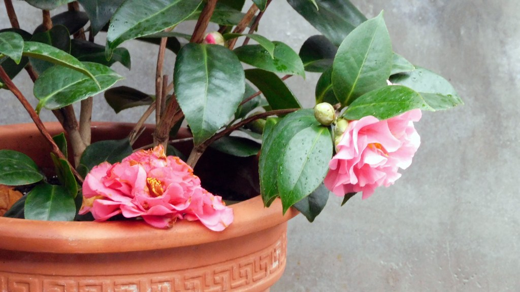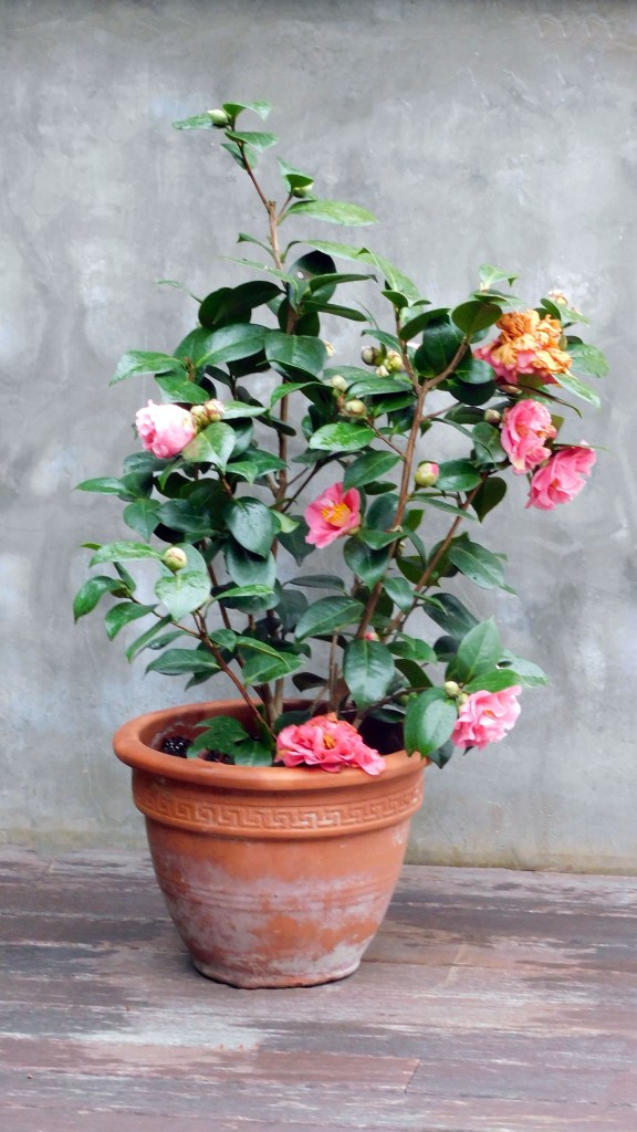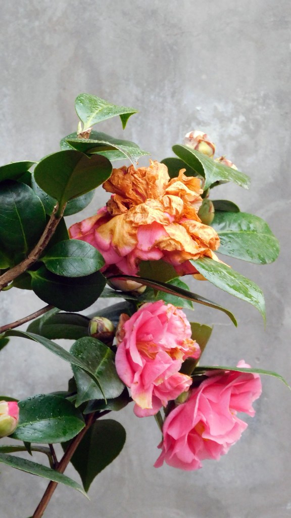 La camelia está cambiando. Además del rosa predominante, ahora aparece el ocre en una mezcla cromática preciosa.
