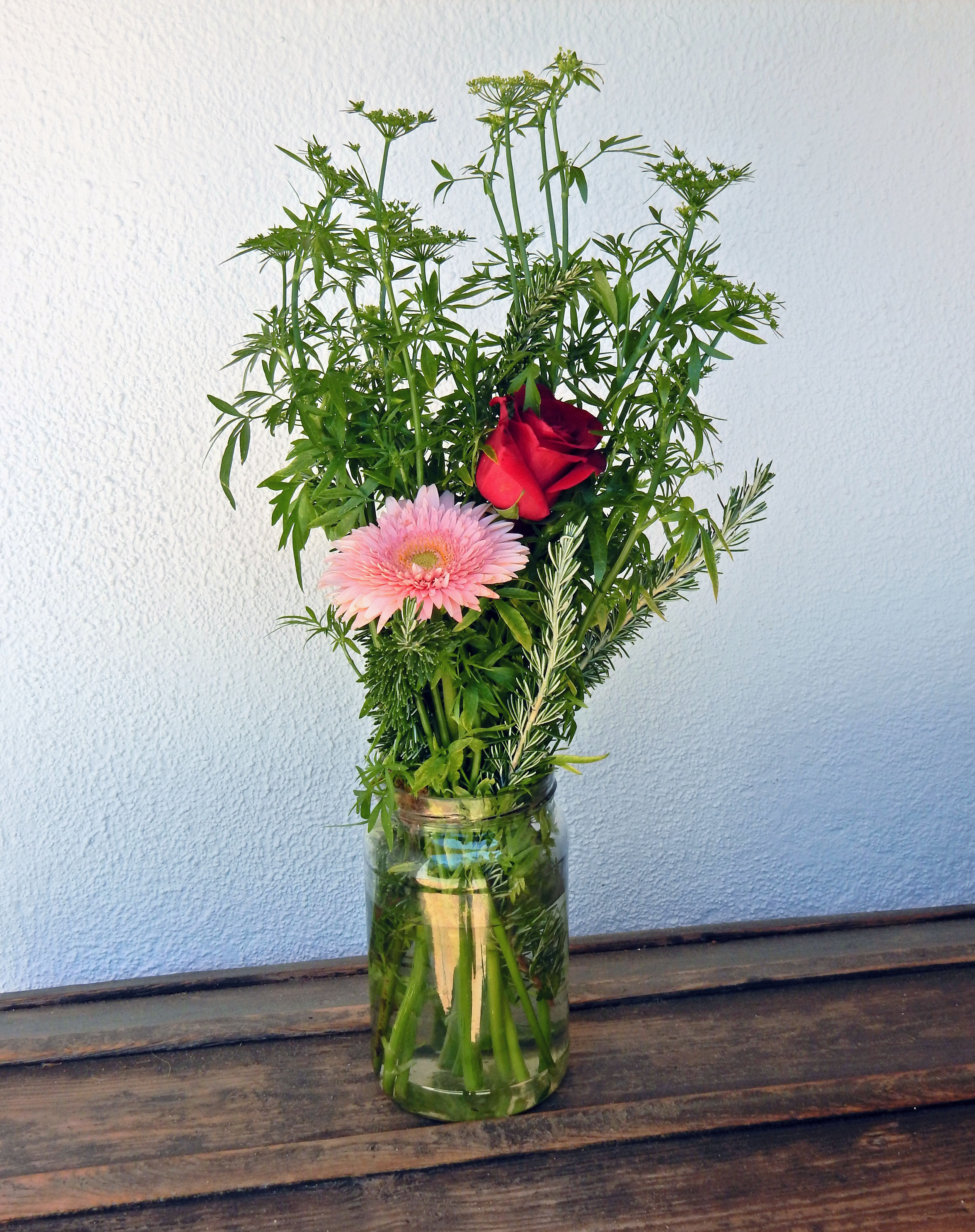 Me regalaron un hermoso manojo de perejil. Lo puse en plan ramo, en un bote de cristal. Más tarde, llegaron a mis manos esta rosa y la gerbera, así que las puse con el perejil.Finalmente, decidí agregarle unas ramas de romero de cosecha propia.