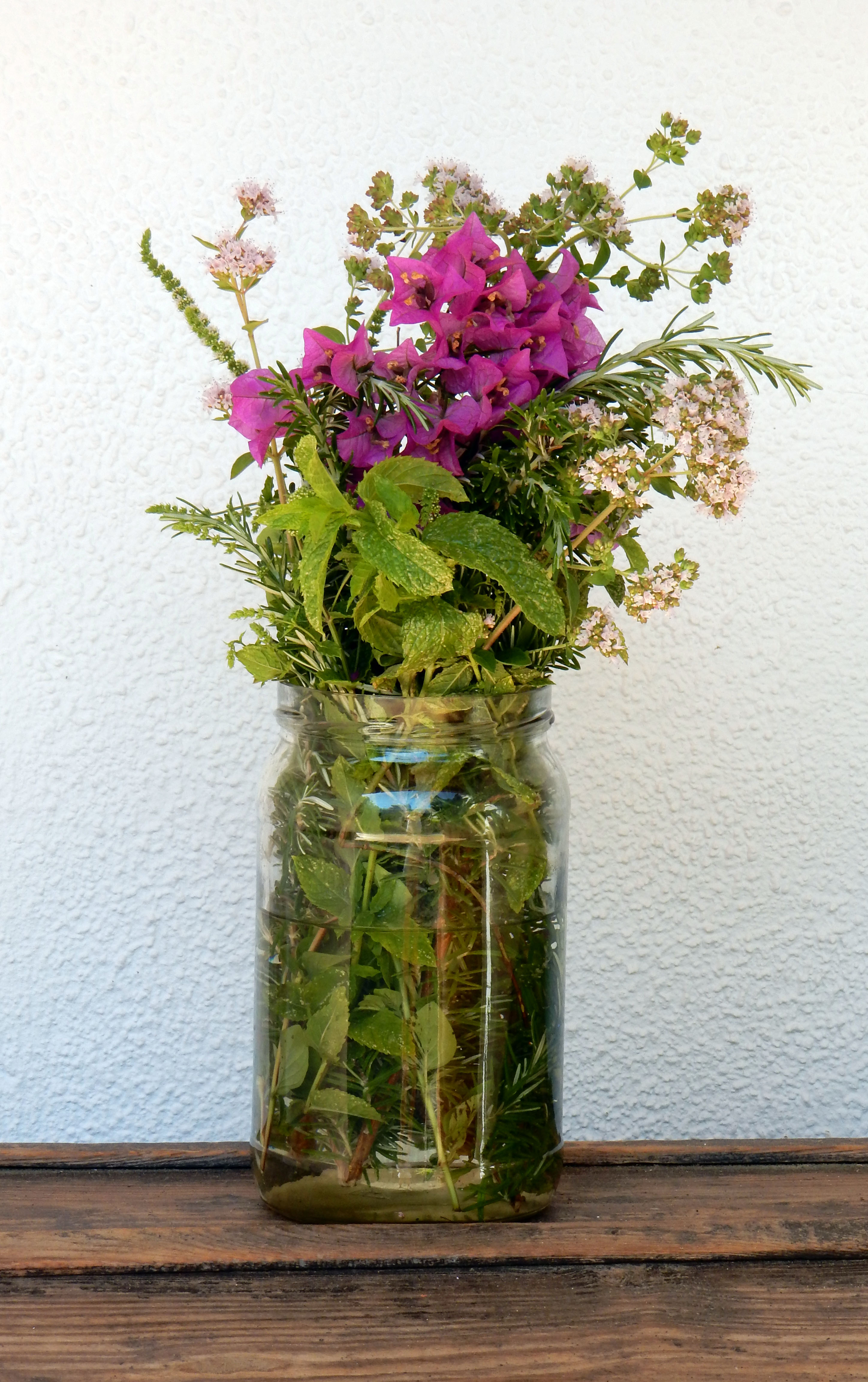 Cuando he acabado , me he dado cuenta que no tenía flores para tan bella-obra-de-arte-del-mundo-del-tarro-de-aceitunas-reciclado así que he ido al huerto y he cortado unas ramas de albahaca en flor, romero y tomillo.