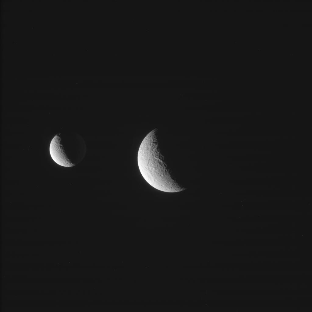 Es una imagen tomada por la sonda Cassini el 11 de octubre de 2015 y recibida en la Tierra el 12 de octubre. Se puede apreciar en primer plano dos de las lunas de Saturno . Rea con Dione en el fondo.