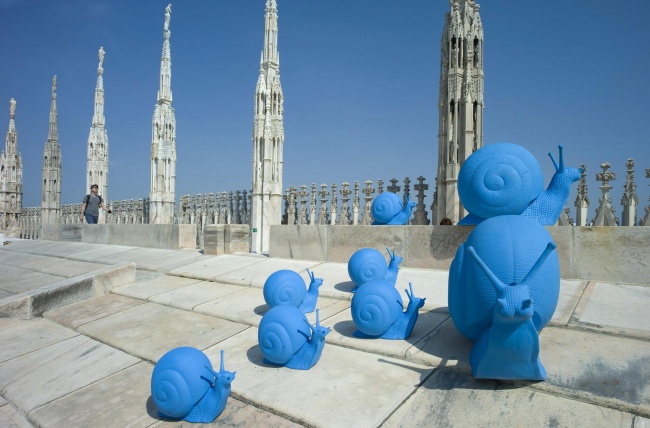 Me han hecho gracia los extraños caracoles azules que aparecieron en el rejado de la Catedral de Milán hace unos años .
