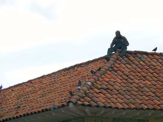 ¿Una escultura en un tejado? Haciendo una búsqueda literal en la red, aparecieron famosas esculturas de edificios históricos. Muy habitual en palacios y catedrales, pero yo buscaba algo más contemporáneo…Además de mis bustos de L’Empordà, añado a la lista, el pescador solitario que hace 15 años, vive en un tejado de La Candelaria en Bogotá.